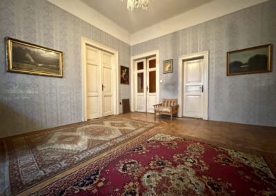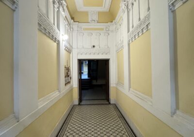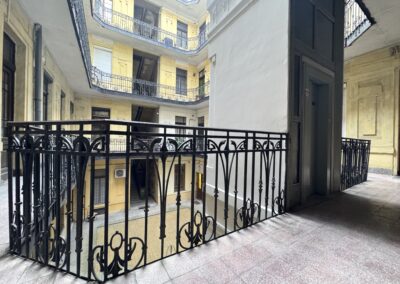 A lakás az első emeleten található. 132 nm + tartozik hozzá egy 8 nm-es privát lichthof terasz is. Eredetileg is 2 bejáratos, és nyílik még egy ablak is a körfolyosóra, így akár 3 lakás is kialakítható. Belmagasság 3.5m. Jelenleg 4 szoba, 2 fürdő, WC, spájz, közlekedő alkotják a helyiséglistát. A három nagy szoba ablakai az utcára néznek.